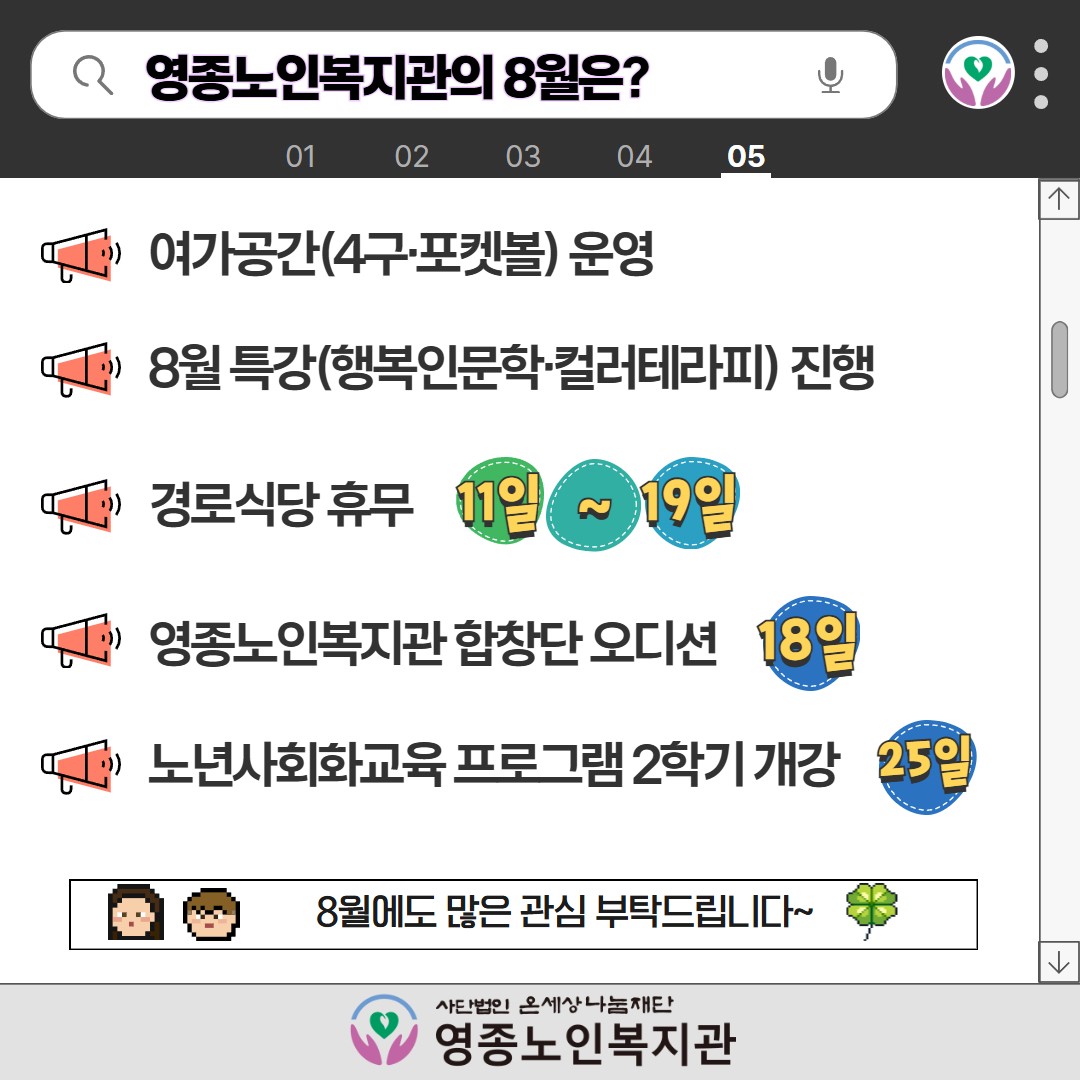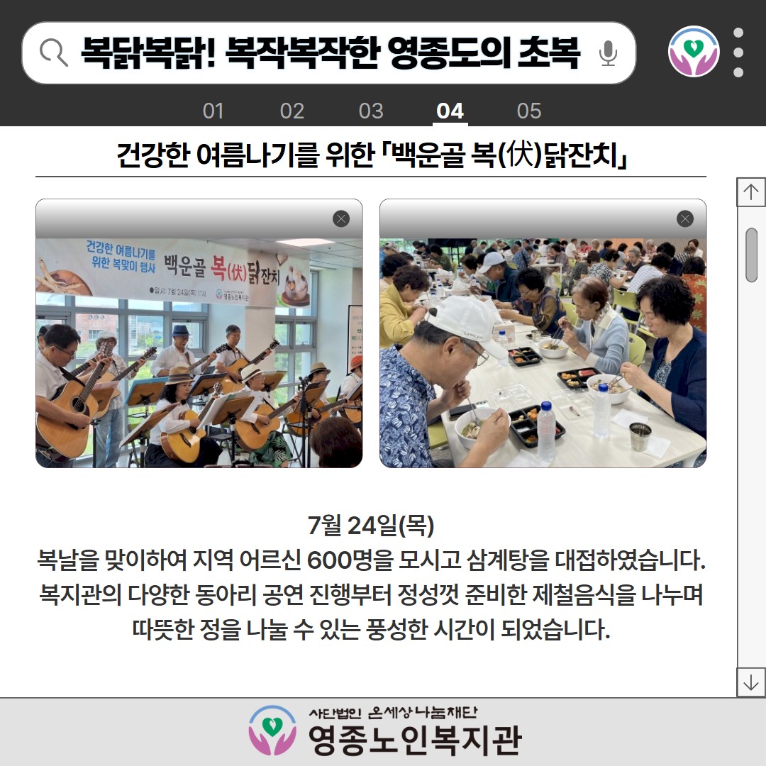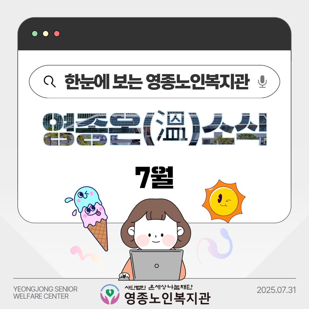 ♬ 띵동 ♬ 영종노인복지관의 7월 소식을 전달드립니다! 페이지 정보 작성자 영종노인복지관 작성일25-08-06 15:33 조회수150 본문 목록 이전글 ♬ 띵동 ♬ 영종노인복지관의 8월 소식을 전달드립니다! 25.09.04