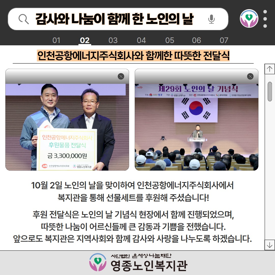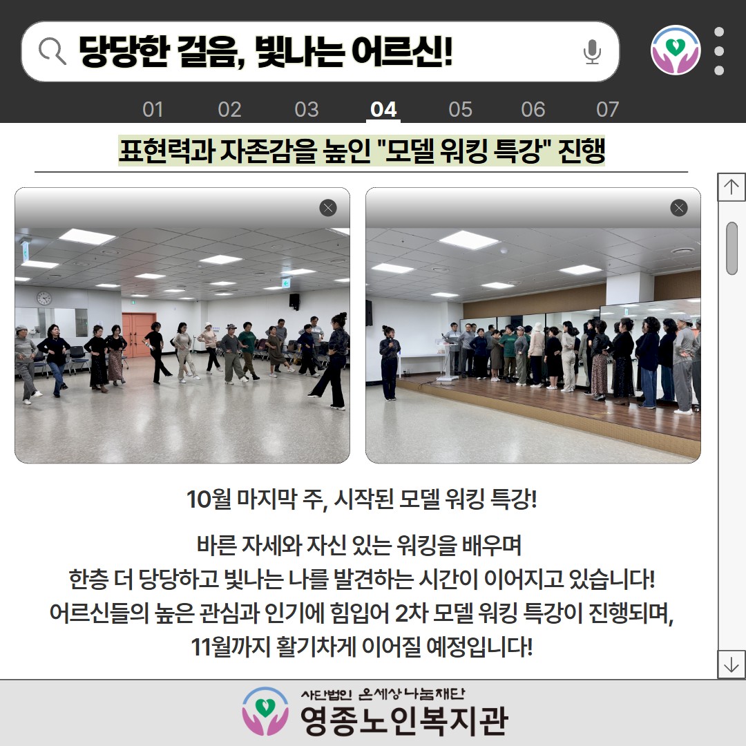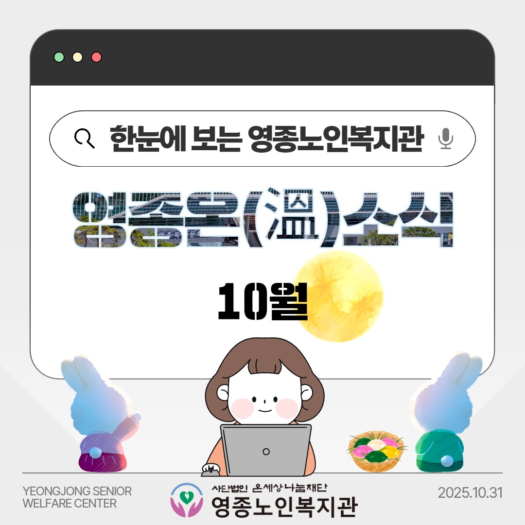 ♬ 띵동 ♬ 영종노인복지관의 10월 소식을 전달드립니다! 페이지 정보 작성자 영종노인복지관 작성일25-11-04 13:03 조회수1,141 본문 목록 이전글 ♬ 띵동 ♬ 영종노인복지관의 11월 소식을 전달드립니다! 25.12.03 다음글 ♬ 띵동 ♬ 영종노인복지관의 9월 소식을 전달드립니다! 25.10.10