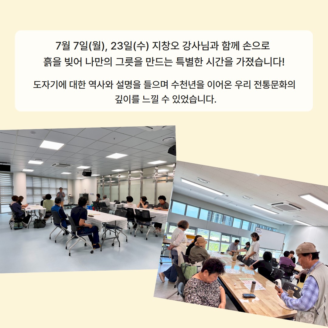[노년사회화교육사업] 7월 특강 '도예교실' 진행 페이지 정보 작성자 영종노인복지관 작성일25-08-04 16:47 조회수108 본문 목록 이전글 [노년사회화교육사업] 8월 특강 '행복 인문학' 진행 25.08.21 다음글 [상담사업] 7월 특강 '그림책원예교실' 진행 25.08.01