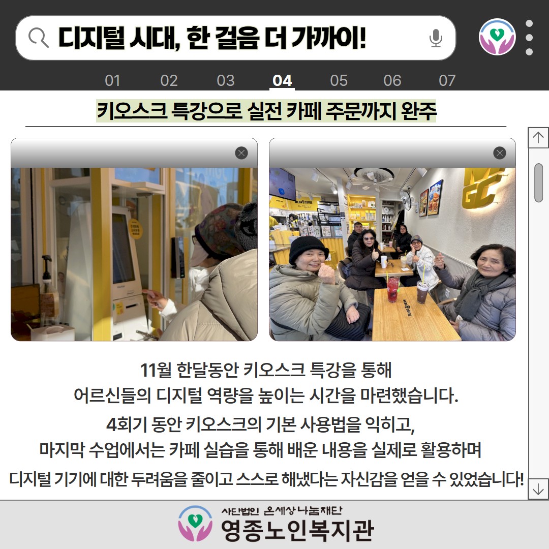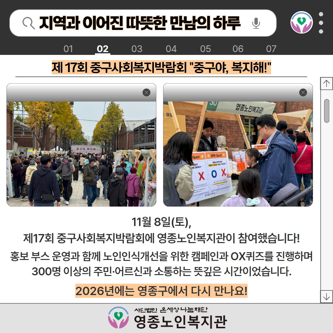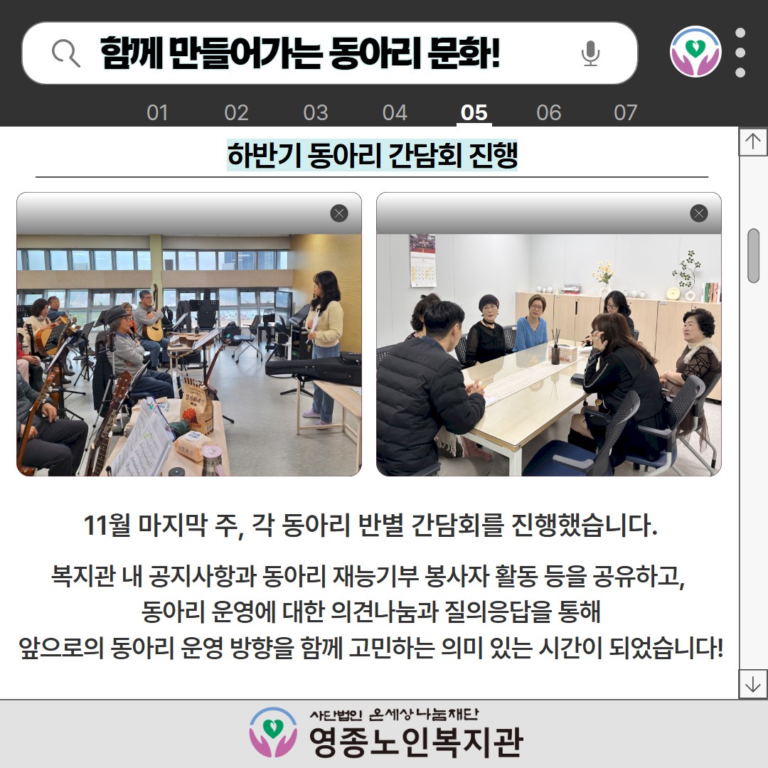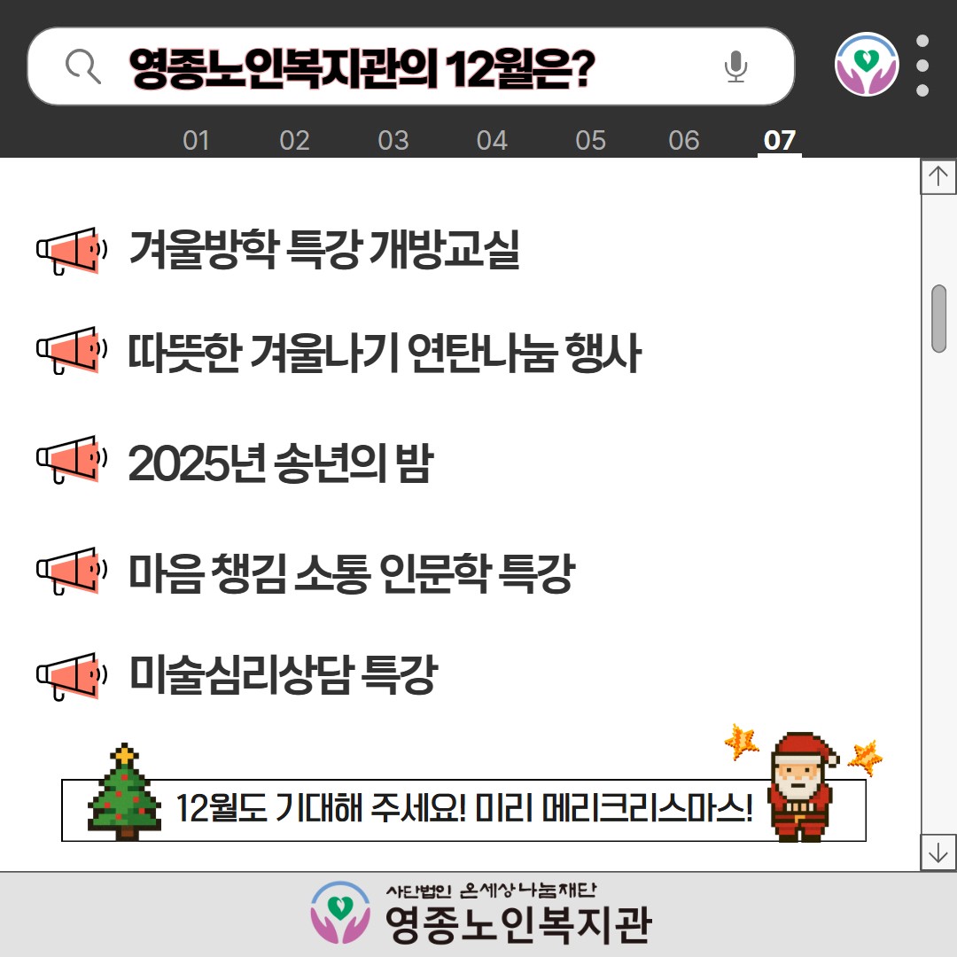 ♬ 띵동 ♬ 영종노인복지관의 11월 소식을 전달드립니다! 페이지 정보 작성자 영종노인복지관 작성일25-12-03 13:58 조회수731 본문 목록 다음글 ♬ 띵동 ♬ 영종노인복지관의 10월 소식을 전달드립니다! 25.11.04