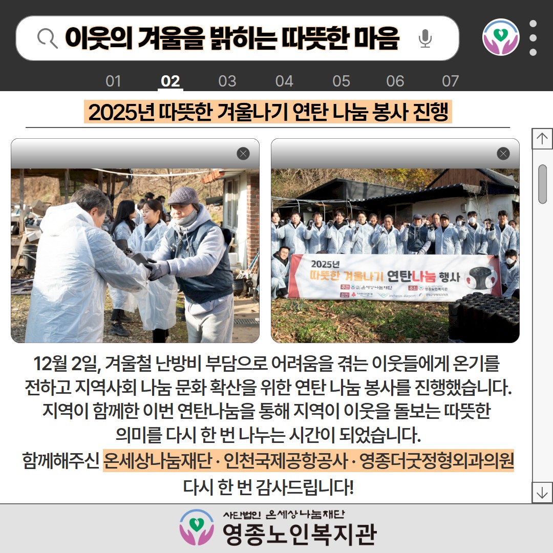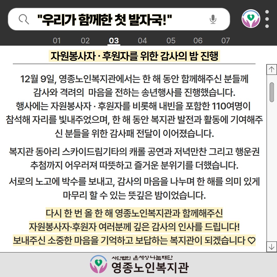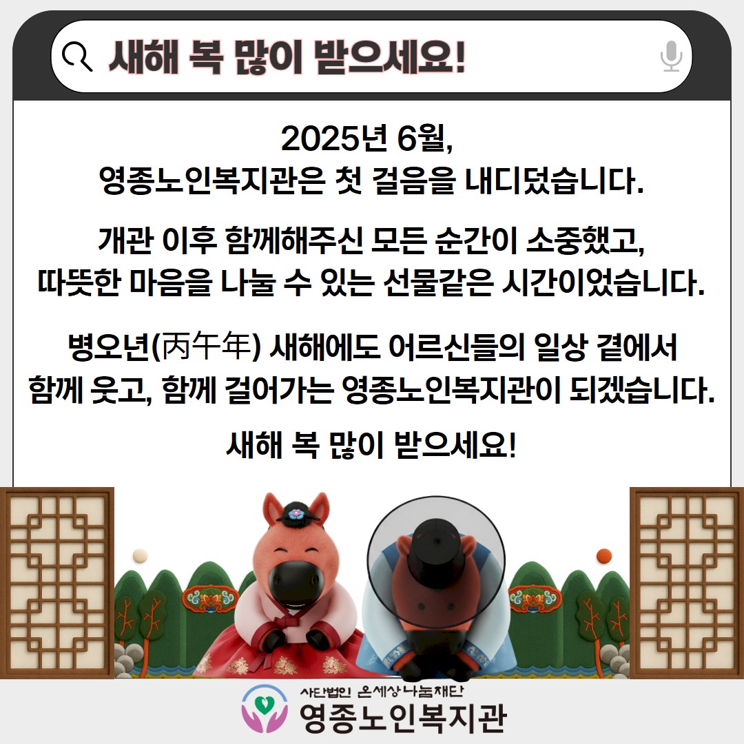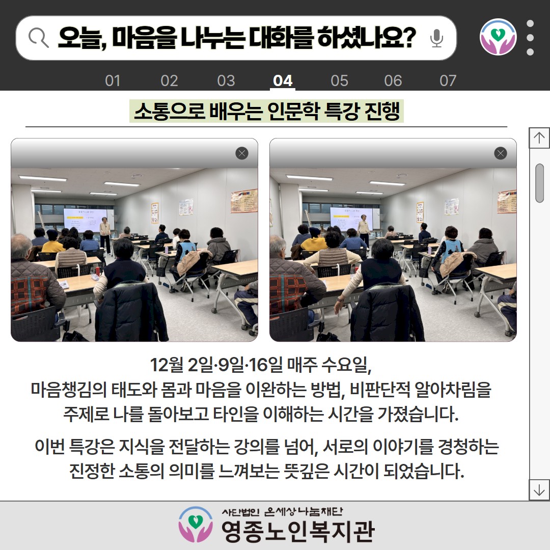 ♬ 띵동 ♬ 영종노인복지관의 12월 소식을 전달드립니다! 페이지 정보 작성자 영종노인복지관 작성일26-01-05 10:29 조회수890 본문 목록 다음글 ♬ 띵동 ♬ 영종노인복지관의 11월 소식을 전달드립니다! 25.12.03