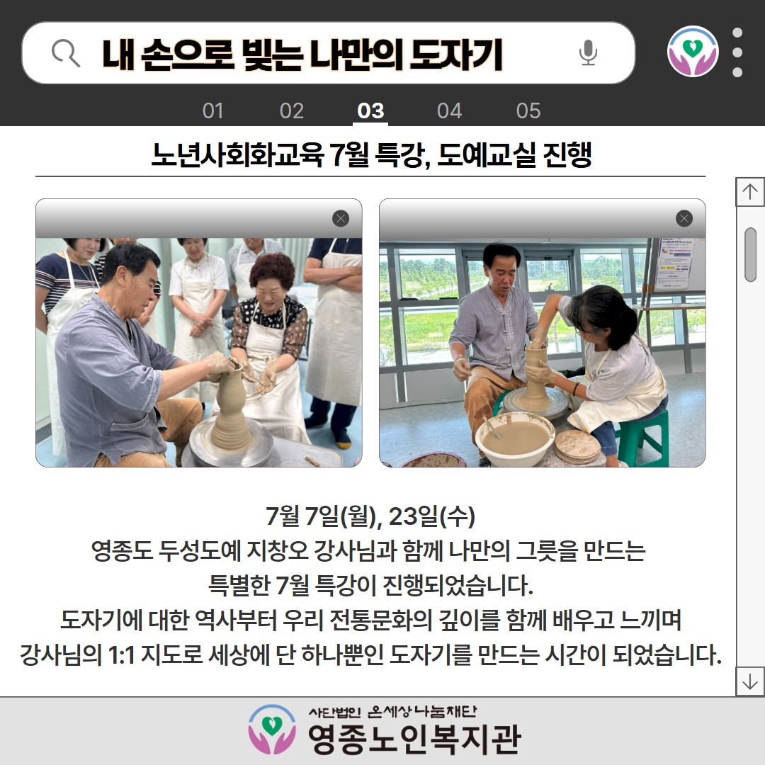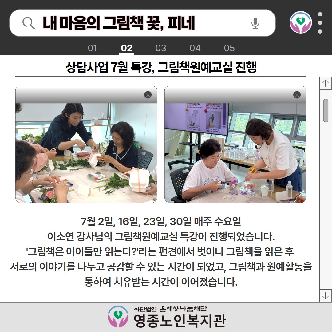 ♬ 띵동 ♬ 영종노인복지관의 7월 소식을 전달드립니다! 페이지 정보 작성자 영종노인복지관 작성일25-08-06 15:33 조회수149 본문 목록 이전글 ♬ 띵동 ♬ 영종노인복지관의 8월 소식을 전달드립니다! 25.09.04