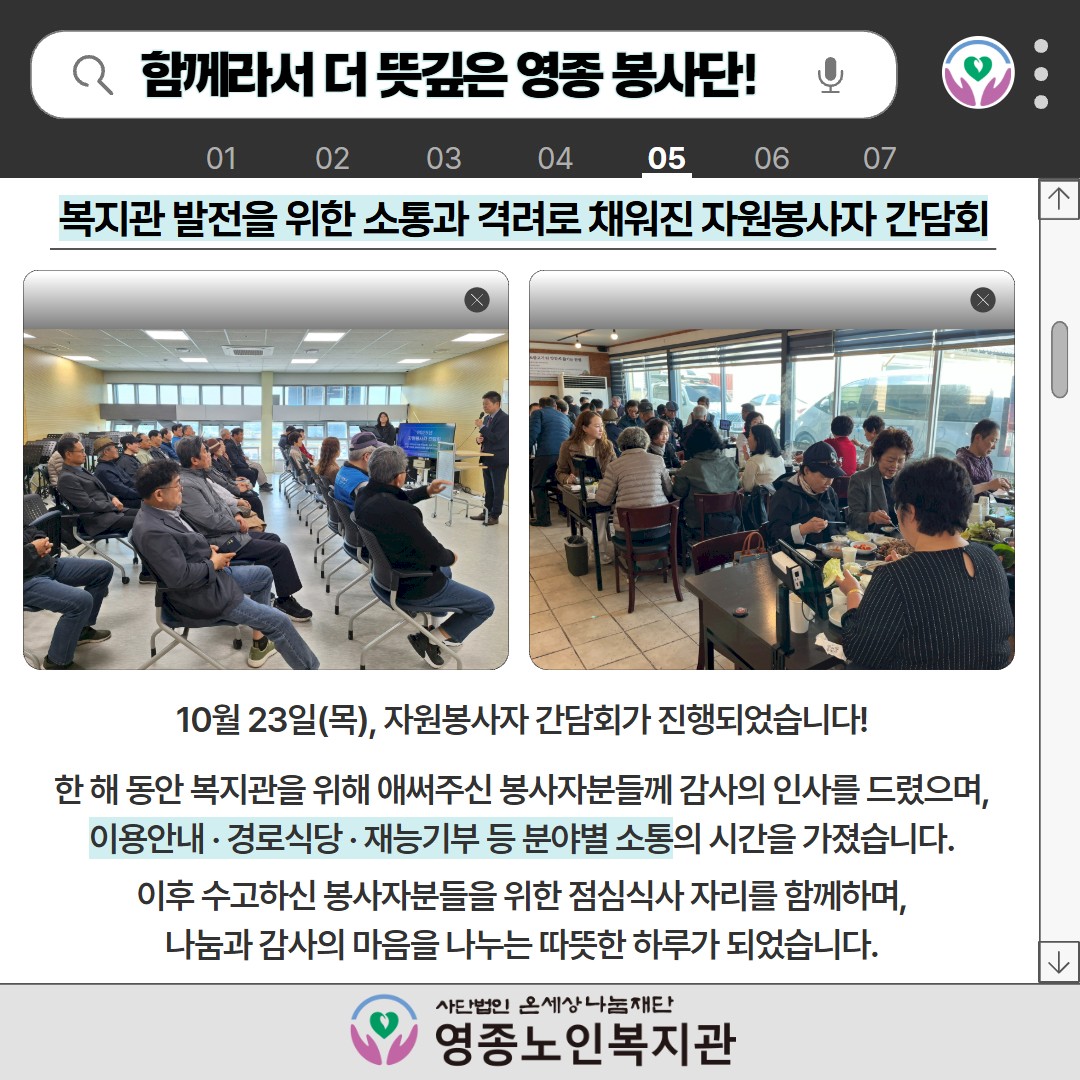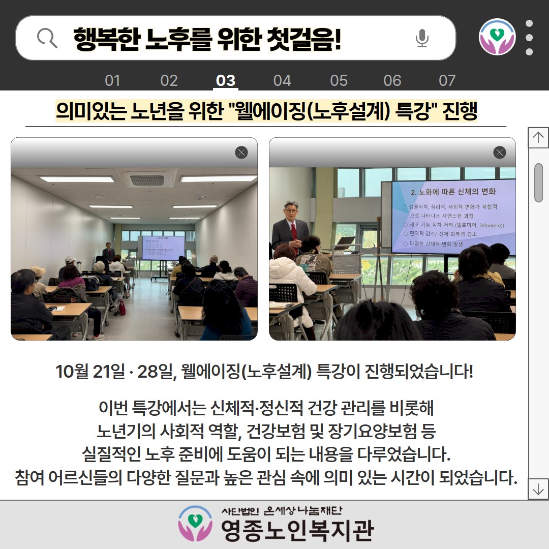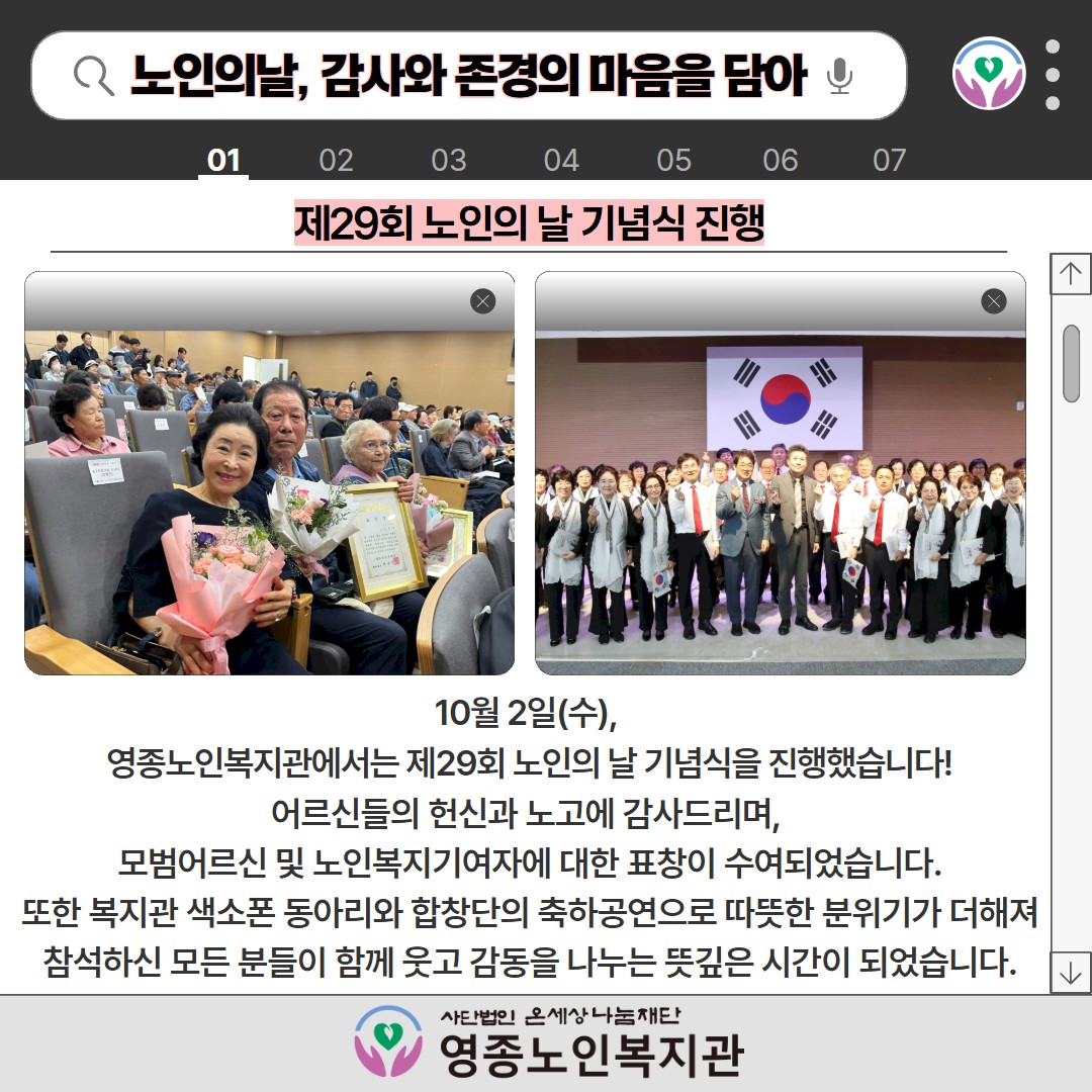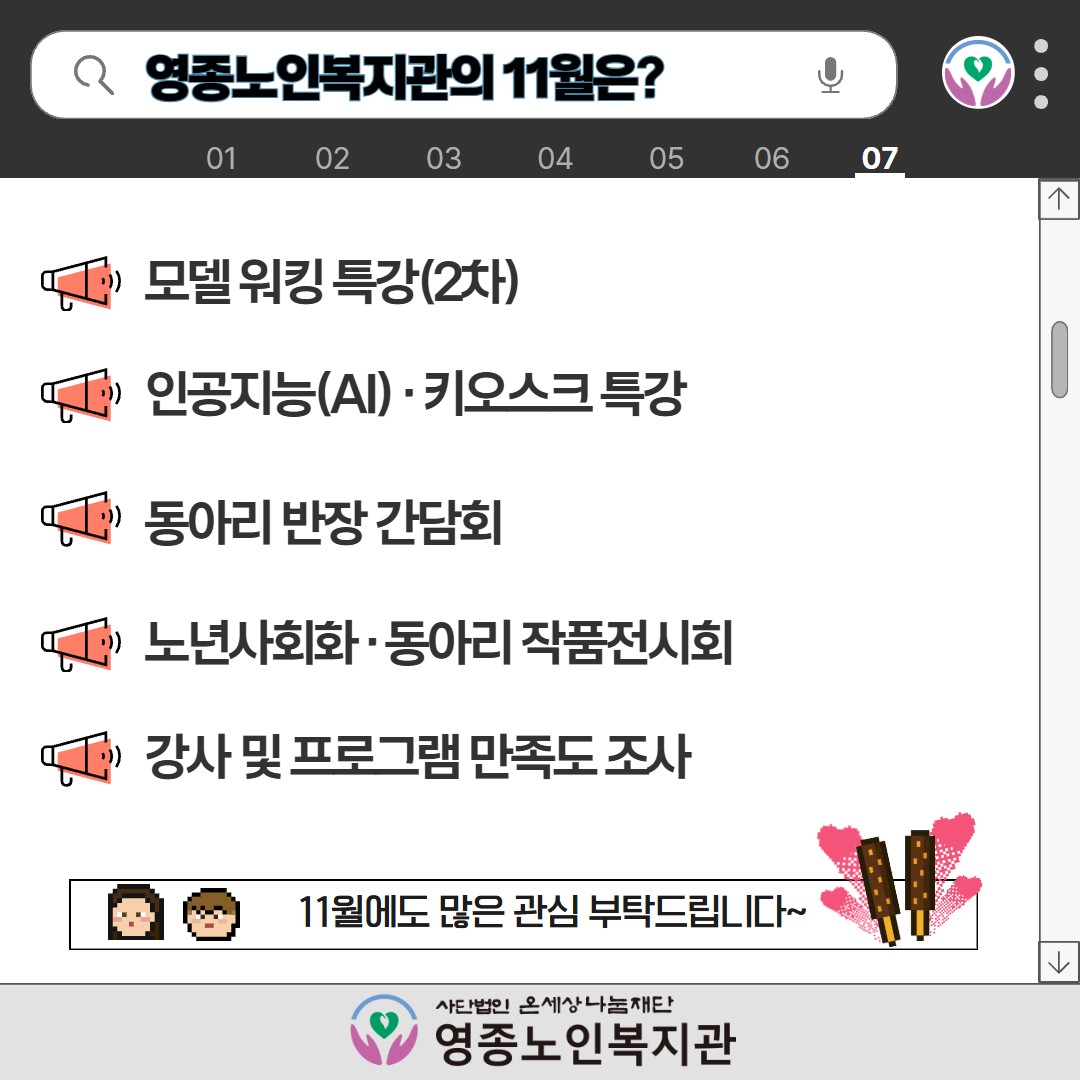 ♬ 띵동 ♬ 영종노인복지관의 10월 소식을 전달드립니다! 페이지 정보 작성자 영종노인복지관 작성일25-11-04 13:03 조회수1,140 본문 목록 이전글 ♬ 띵동 ♬ 영종노인복지관의 11월 소식을 전달드립니다! 25.12.03 다음글 ♬ 띵동 ♬ 영종노인복지관의 9월 소식을 전달드립니다! 25.10.10