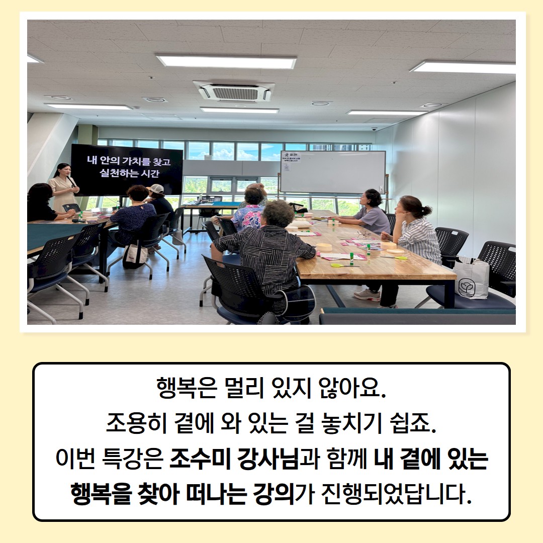 [노년사회화교육사업] 8월 특강 '행복 인문학' 진행 페이지 정보 작성자 영종노인복지관 작성일25-08-21 17:01 조회수99 본문 목록 이전글 영종 어르신들을 위한 새로운 여가공간, 당구장 운영 시작 25.08.22 다음글 [노년사회화교육사업] 7월 특강 '도예교실' 진행 25.08.04
