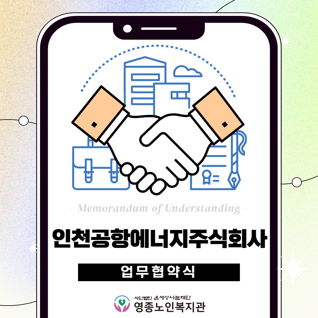 영종노인복지관과 인천공항에너지주식회사는 상호교류와 협력을 통해 지역사회 발전에 기여하고, 상호 간 협력체계를 수립하여 공동 목표의 효울적인 달성을 위해 업무협약을 체결하였습니다.