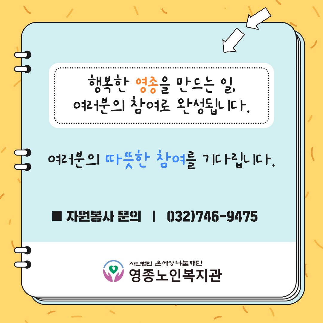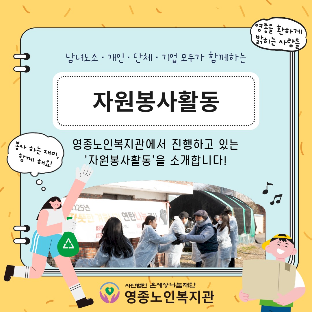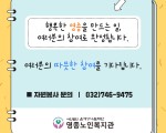 영종노인복지관 자원봉사활동 소개 페이지 정보 작성자 영종노인복지관 작성일26-03-18 14:50 조회수101 본문 목록 이전글 [경로식당 이야기] 정성 가득한 따뜻한 밥상 26.03.19 다음글 [홍보출판] 소식지「동행」2026년 창간호 26.03.18